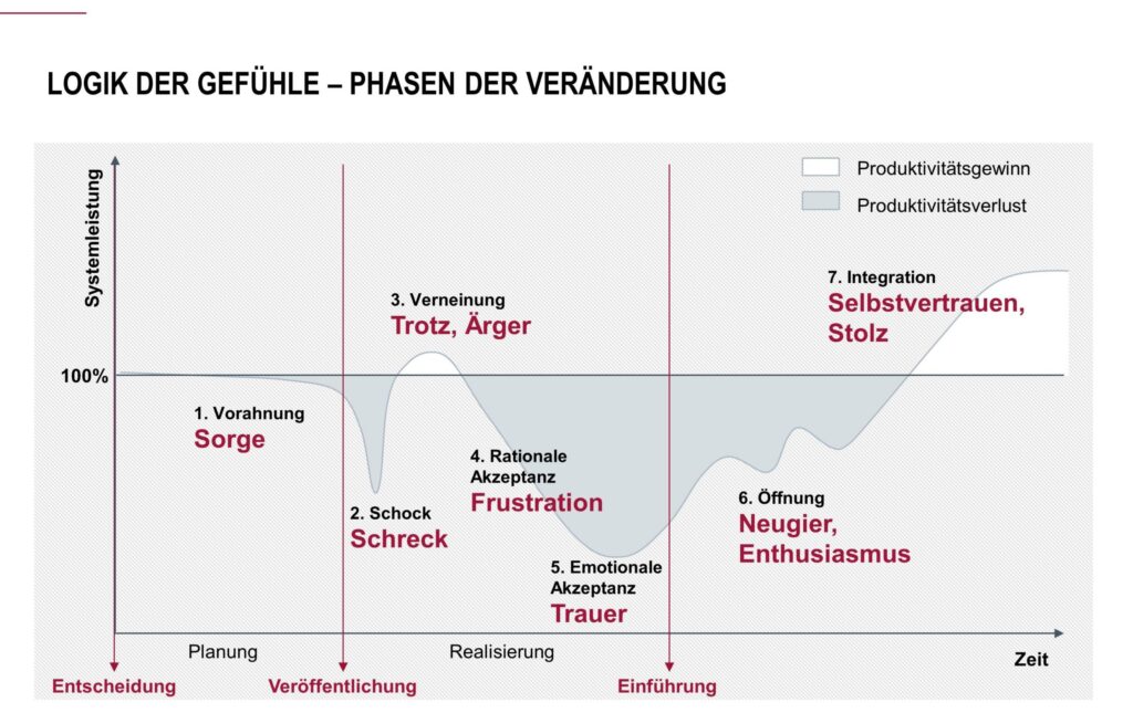 Streich entwickelte das 7-Phasen-Modell, das die emotionale Entwicklung der Mitarbeiter abbildet – beginnend mit der Vorahnung und dem Schock bei der Ankündigung von Veränderungen bis zur Übernahme neuer Denk- und Verhaltensmuster in den Arbeitsalltag bei der Realisation.